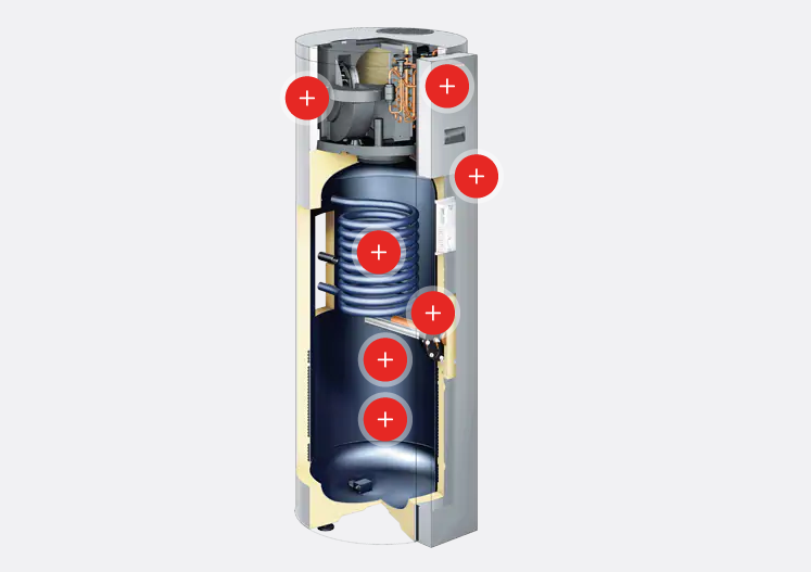 Die Wärmepumpe ist ohne Rohrwendel-Wärmetauscher (Typ T2E) für den monovalenten Betrieb erhältlich. Alternativ wird die Hybridversion mit integriertem Rohrwendel-Wärmetauscher (Typ T2H) angeboten. Sie empfiehlt sich zur Nachrüstung und Aufwertung von Bestandsanlagen. Die intelligente Regelung wählt dann stets die optimale Betriebsweise zwischen Wärmepumpe und Wärmeerzeuger unter Berücksichtigung von Energiepreisen und Primärenergiefaktoren aus. Hierbei übernimmt die Wärmepumpe die Vorerwärmung des Wassers und der vorhandene Wärmeerzeuger wird bei Bedarf für die Nachheizung verwendet. Damit ist immer ein maximaler Warmwasserkomfort gewährleistet.