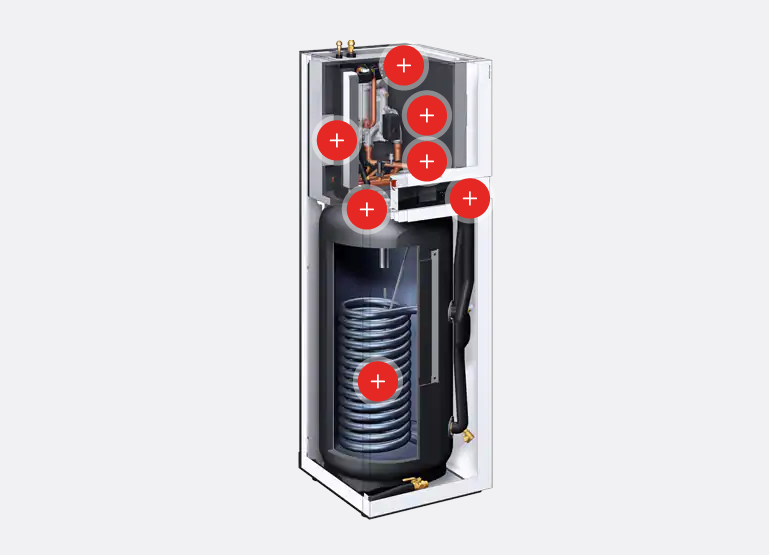 Das Wärmepumpen-Kompaktgerät Vitocal 222-S bietet einen hohen Warmwasserkomfort durch den 212 Liter großen emaillierten Speicher-Wassererwärmer, der über einen innenliegenden Wärmetauscher beheizt wird.