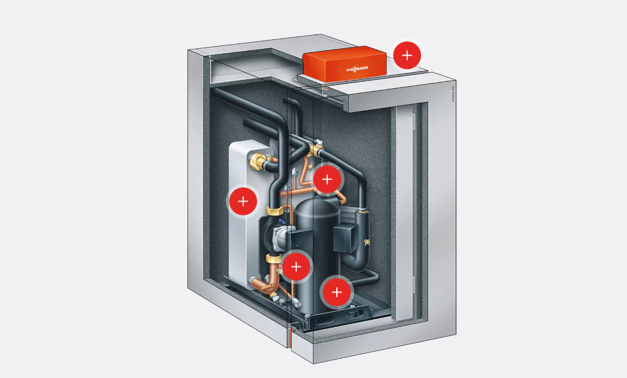 Das Refrigerant Cycle Diagnostic System (RCD) überwacht in der Vitocal 300-G permanent den Kältekreis und sorgt in Verbindung mit dem elektronischen Expansionsventil für höchste Effizienz in jedem Betriebspunkt und somit für hohe Jahresarbeitszahlen.Modulare Lösung für höheren Wärmebedarf